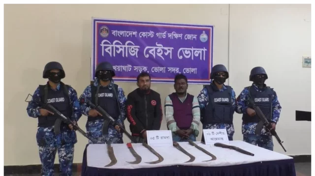 ভোলায় অস্ত্রসহ – ভোলায় একটি আগ্নেয়াস্ত্র এবং ৫টি দেশীয় অস্ত্রসহ বাবা-ছেলেকে আটক করেছে কোস্টগার্ড দক্ষিণ জোন। বুধবার (১৮ ডিসেম্বর) ভোরে সদর উপজেলার দক্ষিণ দিঘলদী ইউনিয়নের কোড়ালিয়া গ্রাম থেকে তাদের আটক করা হয়।